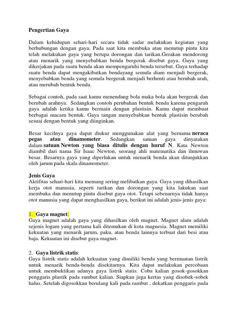 Magnet mempunyai bermacam-macam bentuk yaitu batang silinder jarum bentuk U dan ladam atau tapal kuda. Cahaya menembus benda bening. Gaya otot merupakan salah satu jenis gaya sentuh yang menggunakan tenaga otot atau dihasilkan oleh gaya tarikan dan dorongan.